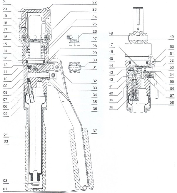 Tento ruční lis pracuje s hydraulickým pístem s lineárním posuvem. Zbětný pohyb pístu je zajištěn pružinou pro zpětný chod, spouští se odlehčovací pákou na kleštích.